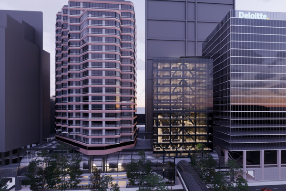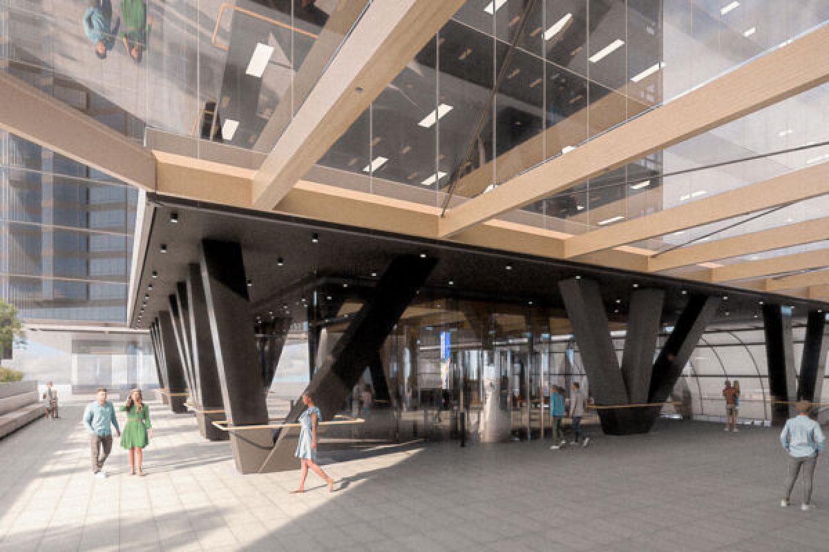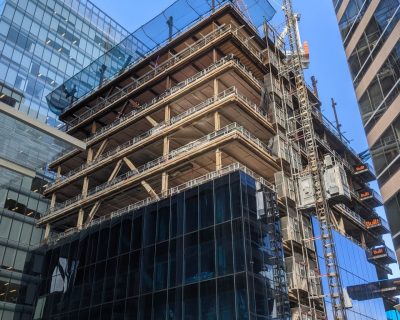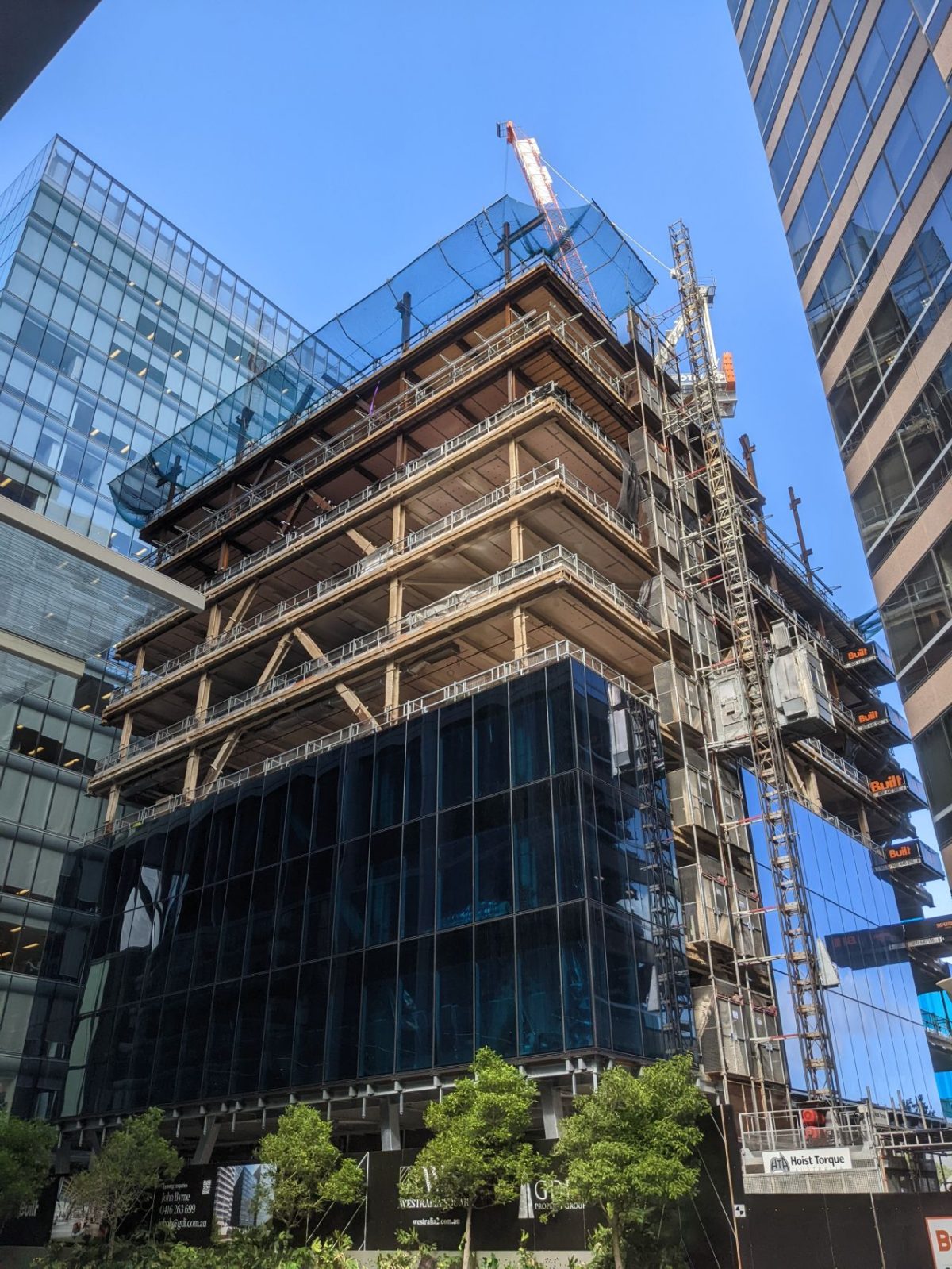 Consisting of a 12-story premium office tower and podium revitalisation, the new Westralia Tower II is a steel-framed structure with CLT floor plates. The hybrid timber and steel frame building is utilising cross laminated timber flooring, glue-laminated timber beams, steel frame core and V braced columns. Building weight was minimised and concrete largely eliminated except for one small plant room floor.